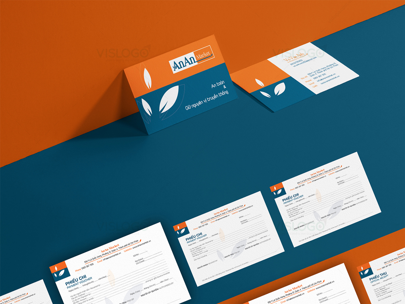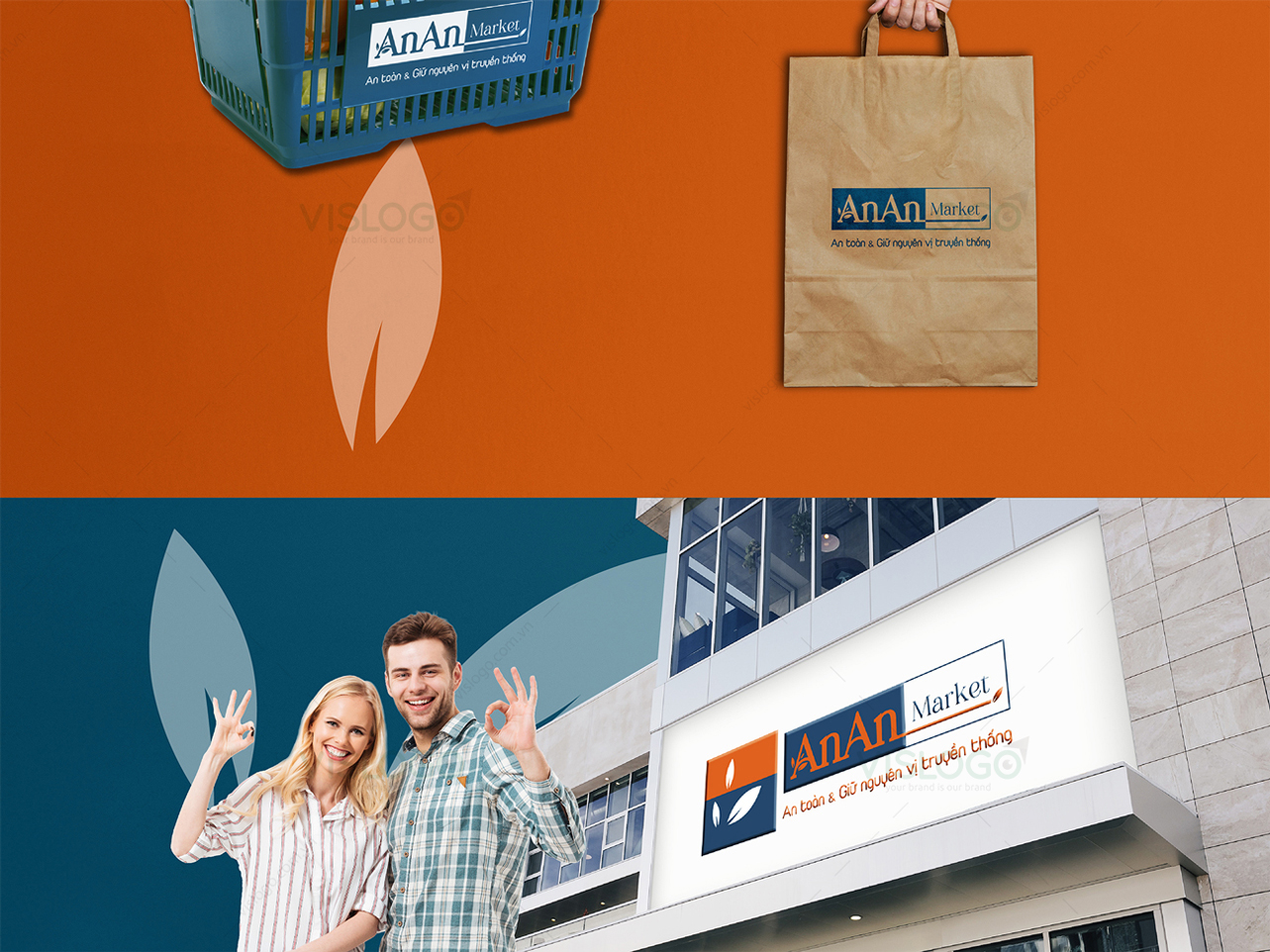 VISLOGO tiếp tục đồng hành cùng VVA trong dự án xây dựng thương hiệu An An Market, từ việc sáng tạo logo thương hiệu, bộ nhận diện thương hiệu, in ấn và gia công thành phẩm các hạng mục thực hiện. Logo được cách điệu chữ A với chiếc lá thể hiện thực phẩm sạch, đơn giản, sang trọng dễ sử dụng. Từ đó, phát triển lên biểu tượng của An An Market với tông màu cam - xanh, thể hiện sự tin tưởng, trách nhiệm cũng như chất lượng đối với khách hàng. Bộ nhận diện thương hiệu với 2 gam màu nổi bật, phù hợp với lĩnh vực, được sáng tạo đồng bộ, xuyên suốt tất cả ấn phẩm.
