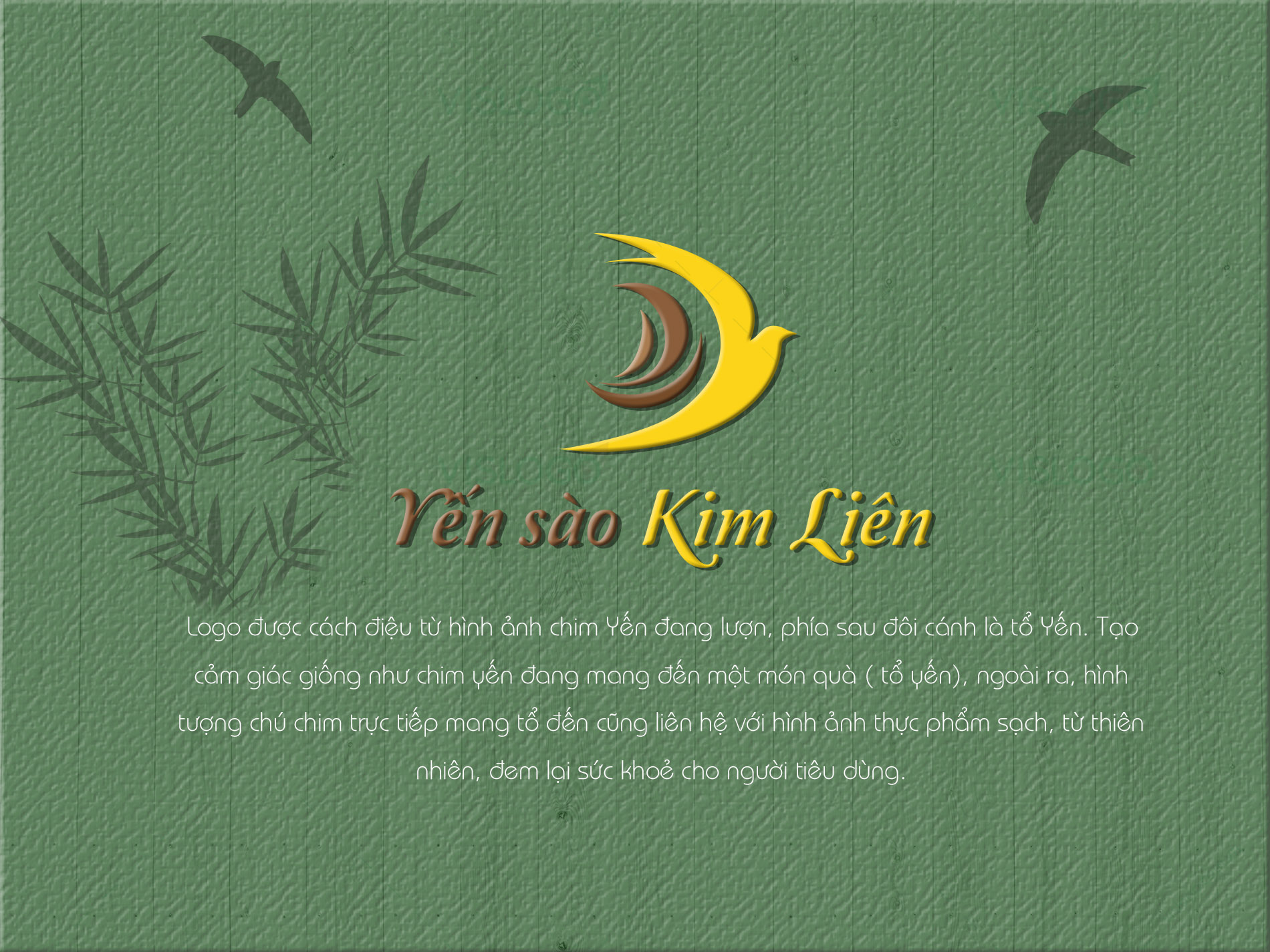 Logo được cách điệu từ hình ảnh chim Yến đang lượn, phía sau đôi cánh là tổ Yến. Tạo cảm giác giống như chim yến đang mang đến một món quà ( tổ yến), ngoài ra, hình tượng chú chim trực tiếp mang tổ đến cũng liên hệ với hình ảnh thực phẩm sạch, từ thiên nhiên, đem lại sức khoẻ cho người tiêu dùng.