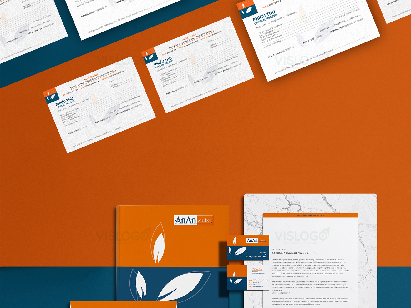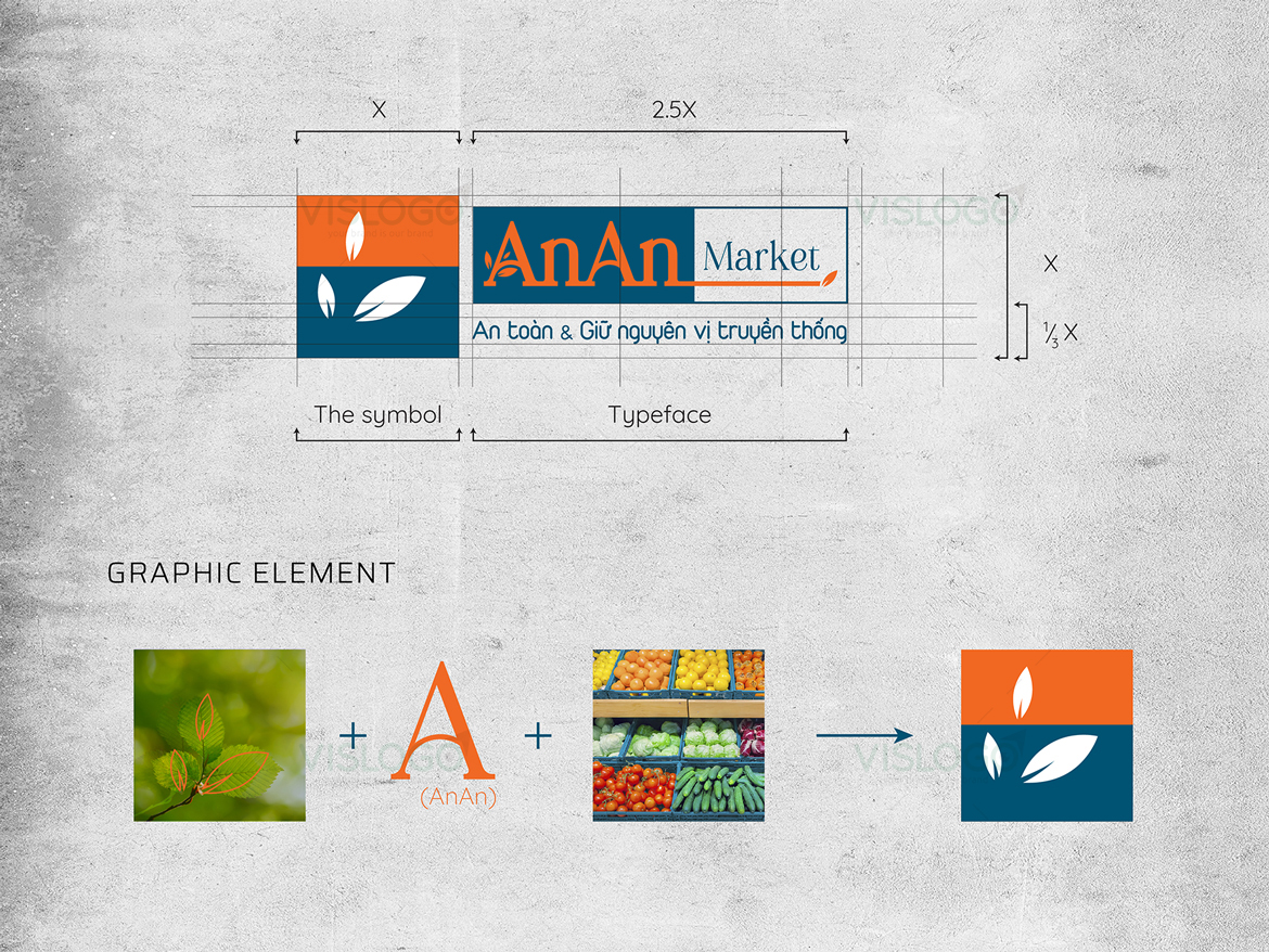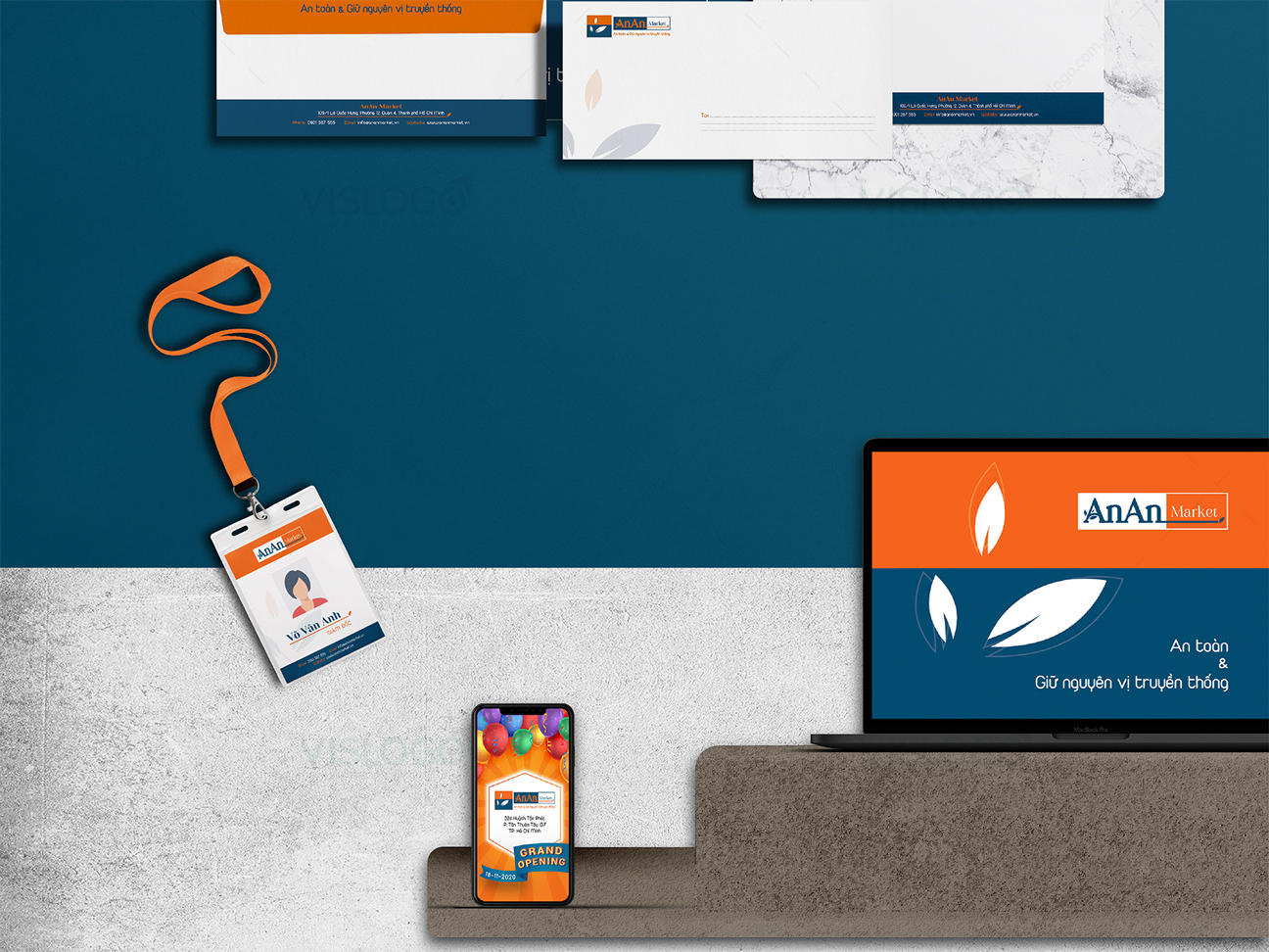 VISLOGO tiếp tục đồng hành cùng VVA trong dự án xây dựng thương hiệu An An Market, từ việc sáng tạo logo thương hiệu, bộ nhận diện thương hiệu, in ấn và gia công thành phẩm các hạng mục thực hiện. Logo được cách điệu chữ A với chiếc lá thể hiện thực phẩm sạch, đơn giản, sang trọng dễ sử dụng. Từ đó, phát triển lên biểu tượng của An An Market với tông màu cam - xanh, thể hiện sự tin tưởng, trách nhiệm cũng như chất lượng đối với khách hàng. Bộ nhận diện thương hiệu với 2 gam màu nổi bật, phù hợp với lĩnh vực, được sáng tạo đồng bộ, xuyên suốt tất cả ấn phẩm.