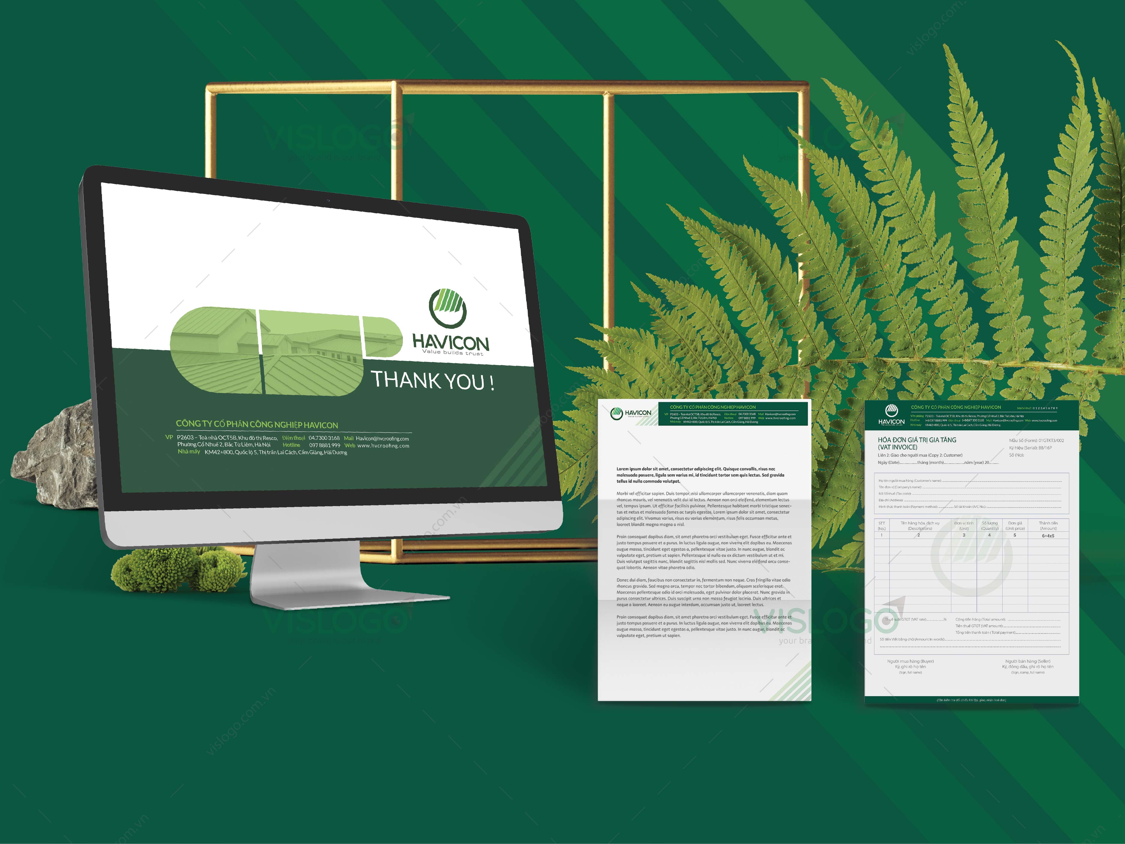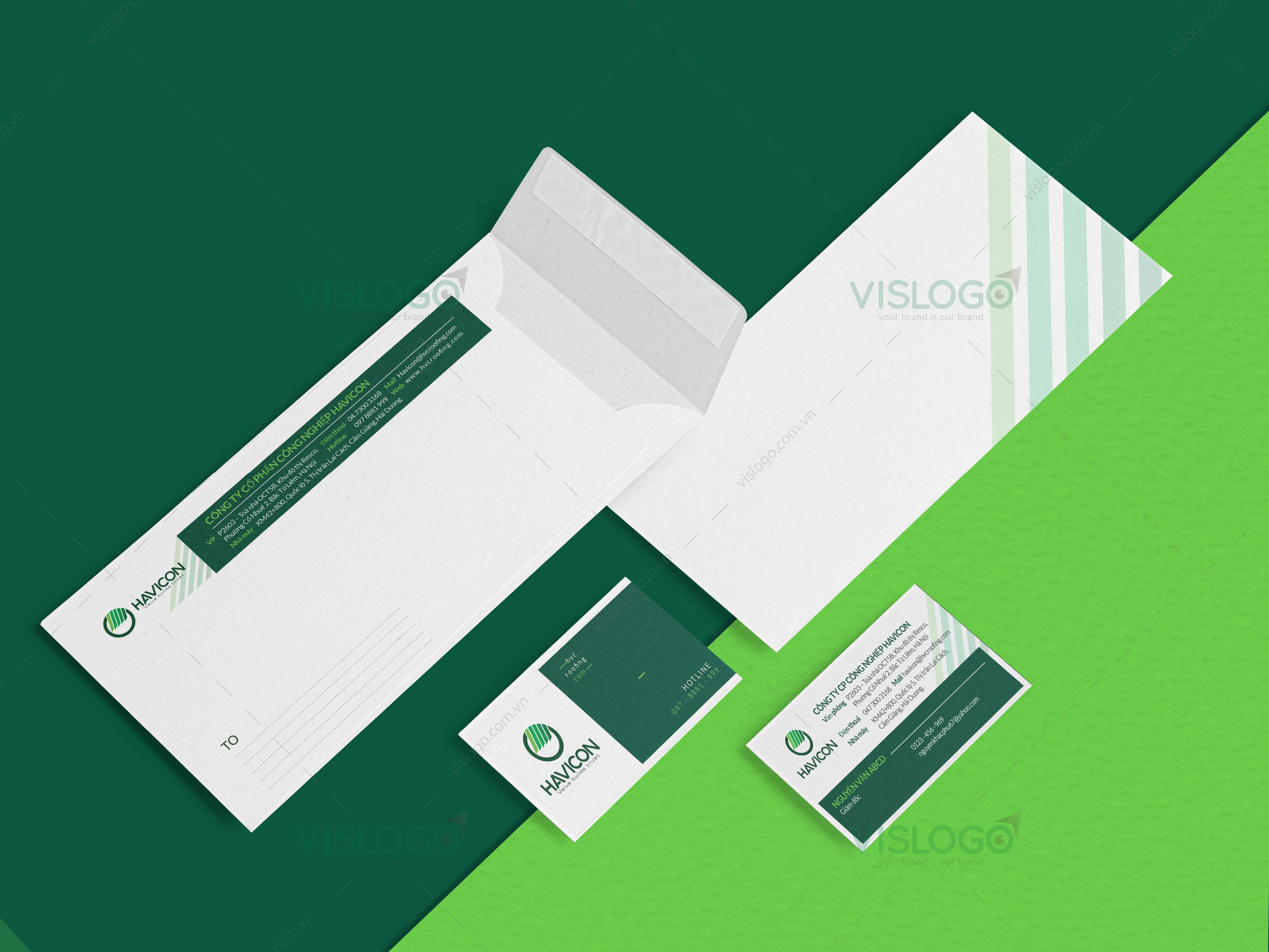 Bên cạnh đó, bộ ấn phẩm nhận diện thương hiệu cho HAVICON cũng được thiết kế hoàn chỉnh với các hạng mục như name card, hóa đơn, folder, phong bì thư, letter head, form mẫu file trình chiếu. Các ấn phẩm đều được thiết kế theo những dấu ấn nhận diện chung của thương hiệu như màu sắc, đường nét tạo điểm nhấn, giúp tạo nên hình ảnh thương hiệu chuyên nghiệp, hiện đại và nổi bật khi so sánh với các đơn vị cung cấp dịch vụ tương tự.